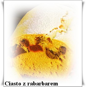 50 dag rabarbaru Rabarbar umyć, obrać, pokroić na małe kawałki. Jajka wybić do miski, dodać cukier, roztopioną margarynę i ubić mikserem. Następnie wsypać obie mąki, proszek do pieczenia, wlać śmietanę, dodać cukier waniliowy i zmiksować. Rabarbar obtoczyć w mące i włożyć do ciasta. Formę wysmarować margaryną i posypać bułką tartą. Ciasto przełożyć do formy. Piec 1 godzinę w piekarniku nagrzanym do temperatury 180 st.C. Po wyjęciu z piekarnika ostudzić i posypać cukrem pudrem.