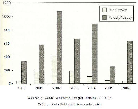 Od 29 września 2000 r. do końca maja 2008 r. siły izraelskie zabiły ponad 5,1 tys. Palestyńczyków (wykres 5). [ W palestyńskich atakach zginęło również ponad tysiąc Izraelczyków. Światło na skalę śmiertelności wśród Palestyńczyków rzucić może następujące porównanie: gdyby Stany Zjednoczone straciły podobny odsetek ludności, oznaczałoby to nagłą śmierć 385 tys. osób – ponad 120 razy więcej niż zginęło w zamachach 11 września.
