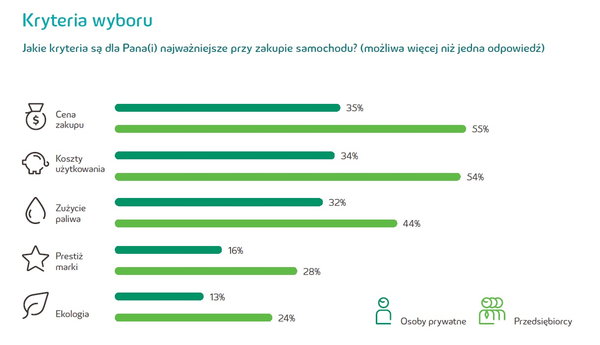 Co ciekawe, przedsiębiorcy częściej zwracają uwagę na ekologiczny aspekt pojazdu. Przy wyborze ma to znaczenie dla niemal co czwartej firmy (24 proc.) i zaledwie dla 13 proc. osób prywatnych.