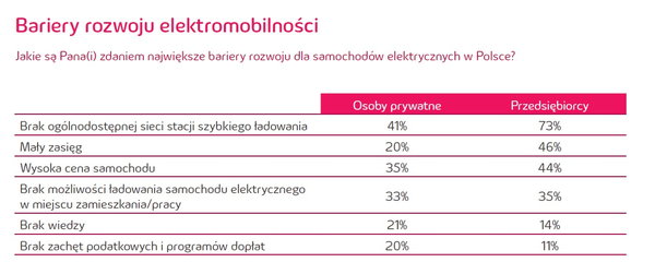 Osoby prywatne w dalszej kolejności wskazują wysoką cenę aut elektrycznych – 35 proc. Dla jednej trzeciej istotną przeszkodą jest brak możliwości ładowania w domu i miejscu pracy.
