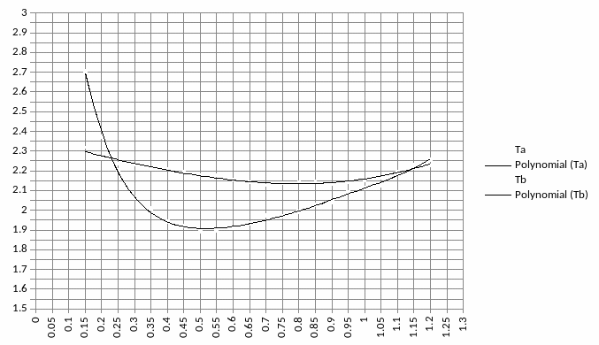 Z wykresu należy odczytać wartości drgań wahadła rewersyjnego odpowiadające punktom przecięcia krzywych TA(lA) oraz TB(lA) i obliczyć ich średnią arytmetyczną.