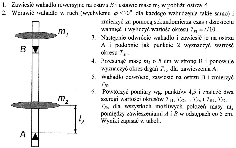 Wahadło rewersyjne składa się z metalowego pręta zaopatrzonego w dwie pary ostrzy O1 i O2 , które znajdują się w stałej odległości. Służą one do zawieszania wahadła na odpowiedniej podstawce. Obok ostrzy, na pręcie znajdują się dwie masy: m1 - umocowana na stałe i m2 - ruchoma. Masę m2 można przesuwać wzdłuż pręta pomiędzy punktami A i B zmieniając w ten sposób położenie środka masy wahadła. Przy pewnym położeniu masy m2 na pręcie okres wahadła rewersyjnego T przy zawieszeniu zarówno na ostrzu O1 jak i O2 będzie identyczny. Wyznaczając ten okres drgań i mierząc odległość między ostrzami równą długości zredukowanej wahadła rewersyjnego lr możemy obliczyć przyspieszenie ziemskie ze wzoru: