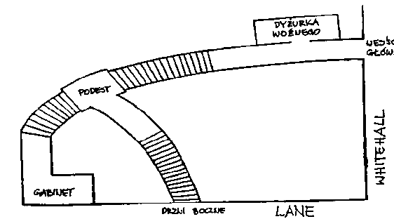 Przepisałem dwa następne artykuły, ale czując, że jestem coraz bardziej senny, wstałem i przespacerowałem się po pokoju. Nie mogłem zrozumieć, dlaczego jeszcze nie podano mi kawy. Otworzyłem więc drzwi gabinetu, w którym pracuję, i wyszedłem na ciemny i słabo oświetlony korytarz. Było to jedyne wyjście z mojego pokoju. W połowie drogi na klatce schodowej znajdował się mały podest, od którego pod kątem prostym odchodzi drugi, mniejszy korytarz. Na dole, jak już mówiłem, jest dyżurka woźnego. Korytarz biegnie dalej do schodków prowadzących do bocznych drzwi, używanych przez służbę i urzędników, którzy skracają sobie w ten sposób drogę z Charles Street. Proszę, tu jest odręczny szkic.