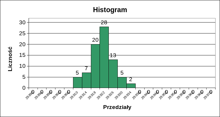 Histogram pokazuje, że w wykonana serja pomiarów jest prawidłowa tzn. wszystkie pomiary zawierają się |