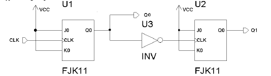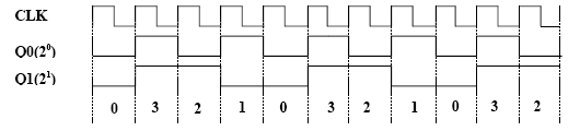 Przyjmując, że sygnał wejściowy CLK jest przebiegiem prostokątnym na wyjściach Q0 i Q1