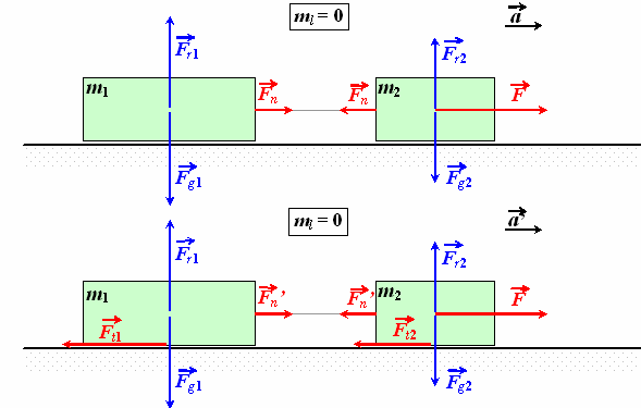 w przypadku ciał wykonanych z tego samego materiału (o jednakowych współczynnikach tarcia o podłoże) obecność tarcia wpływa na przyspieszenie układu, ale nie wpływa na siłę naprężenia linki