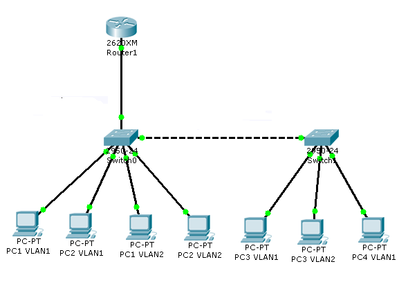 1. Wykorzystując sieć z zadania 4 skonfigurować protokół VTP, w której Switch0 pracuje w trybie serwera VTP, a Switch1 klienta.