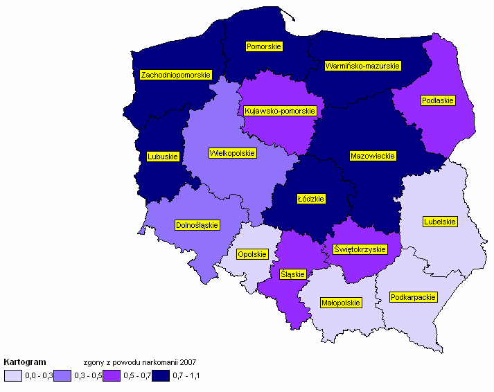 Kartogram 1, Zgony z powodu narkotyków wskaźnik na 100 tysięcy mieszkańców w 2007 roku – dane GUS