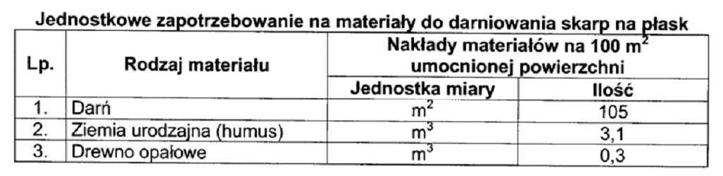 3. Obliczenia ilości materiałów niezbędnych do wykonania robót: Zapotrzebowanie na materiały niezbędne do darniowania skarp: