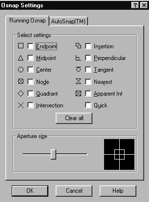 W oknie dialogowym Osnap Settings należy zaznaczyć odpowiednie punkty charakterystyczne i nacisnąć OK.