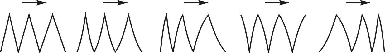 6. Do wody wrzucono trzy klocki. Klocek 1 utonął; klocek 2 pływa częściowo wynurzony z wody; statek zwiększa swą prędkość. Jaki kształt ma tor bosmana względem wody? Strzałka pokazuje