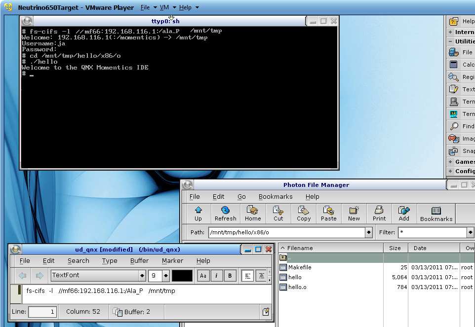 1. Uruchamiamy QNX na maszynie wirtualnej. Tworzymy w systemie QNX foldery / mnt/tmp – dla foldera TMP nadajemy prawa wykonywania x.