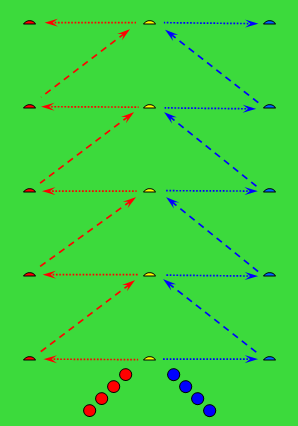 Zawodnicy z poszczególnych grup ustawieni są przy środkowych, żółtych talerzykach. Na sygnał poruszają się w truchcie do talerzyków ustawionych na zewnątrz /niebiescy do niebieskich, czerwoni do czerwonych/. Przy talerzykach wykonują szybki zwrot i start do środka, do żółtych talerzyków. Następnie znowu poruszają się w truchcie do zewnętrznych i powtarzają ćwiczenie.