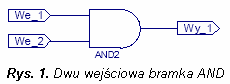 W celu zapoznania się z programem Xilinx stworzyliśmy model układu logicznego składającego się z jednego, podstawowego, funktora – bramki AND. W pierwszej kolejności stworzyliśmy plik o rozszerzeniu .sch w którym powstał schemat ( Rys. 1). Po opisaniu wejść i wyjść w sposób nam odpowiadający przeszliśmy do
