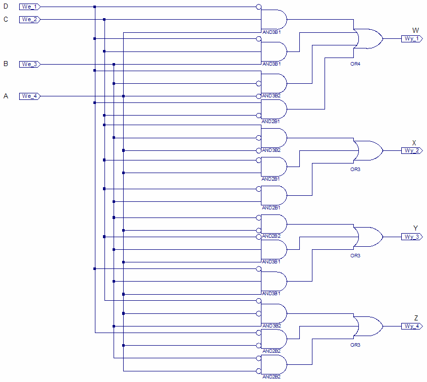 Nasz schemat składa się z 4 bramek OR oraz 13 bramek AND. Wynika to m.in. stąd, że przy minimalizacji posłużono się kanoniczną postacią sumy. Gdyby minimalizację robić zapisując w kanonicznej postaci iloczynu proporcje bramek byłyby odwrotne. Warto zwrócić uwagę na to, że w przypadku realizacji rzeczywistego układu ma się swoistą ograniczoną dowolność w konstrukcji określonych urządzeń i można, w zależności od np. dostępności pewnych funktorów, przeprojektować układ.