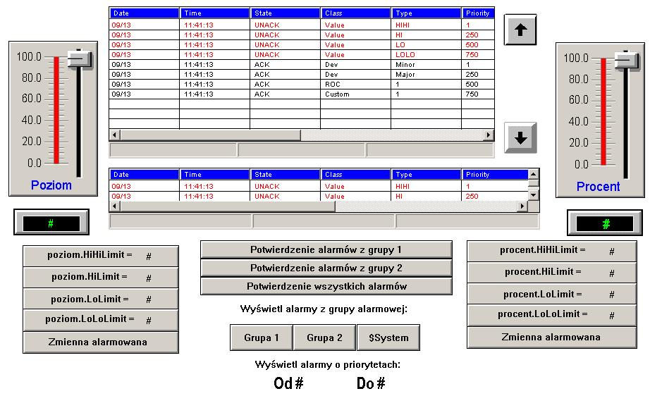Grupa2 wyświetla tylko alarmy z grupy grupa2, zaś przycisk $System wyświetla alarmy z