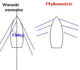 Przy wejsciu na pżytkowodzie z predkoscia krytyczna (V kr = sqr (g * ho)) ho-gżebokosc obszaru zwieksza sie ka t odchodzenia fali. Jez eli uda sie wejsc z taka predkoscia to fala odejdzie pod ka tem 90o.