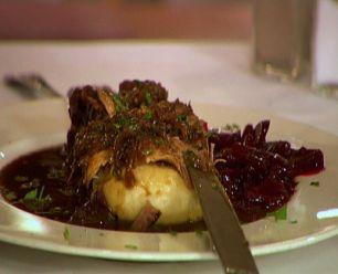 Dobrze nagrzać brytfannę z odrobią smalcu (wytopionego ze słoniny). Dobrze obsoterować mięso z każdej strony przez ok. 15 minut. Gdy mięso dobrze się przyrumieni dodać ok 1 kg cebuli pokrojonej w piórka i dobrze podsmażyć podlewając jednocześnie czerwonym mocnym winem (ok. 0,5 litra). Przyprawić kminkiem (ok. 3-4 łyżek), pieprzem i odrobiną czerwonej papryki. Dusić pod przykryciem ok. 3 godzin. W trakcie duszenia polewać wytrawnym bulionem. Po trzech godzinach odstawić brytfannę na lekko gorącą płytę (ok 70-80 stopni) i tak zostawić na następną godzinę.