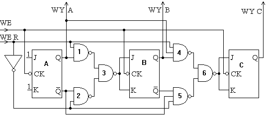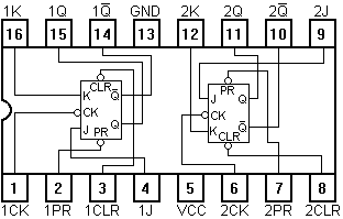 2. Z trzech przerzutników JK (potrzebne dwa układy scalone UCY7476)