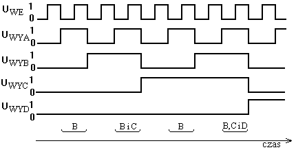 oraz na wyjściach A, B, C i D układu scalonego UCY7493. Wskazane