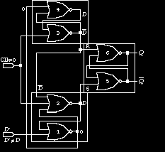 Przerzutnik D typu flip-flop jest przerzutnikiem wyzwalanym aktywnym zboczem zegara. Nie występuje tu zjawisko łapania jedynek, co znacznie ułatwia projektowanie. Układ składa się z trzech przerzutników RS. Bramki 5 i 6 sterują wyjście. Bramki 3 i 4 pamiętają zatrzaśnięty stan. Bramki 1 i 2 kontrolują wejście D. Przerzutnik zapamiętuje opadającym zboczem zegara.