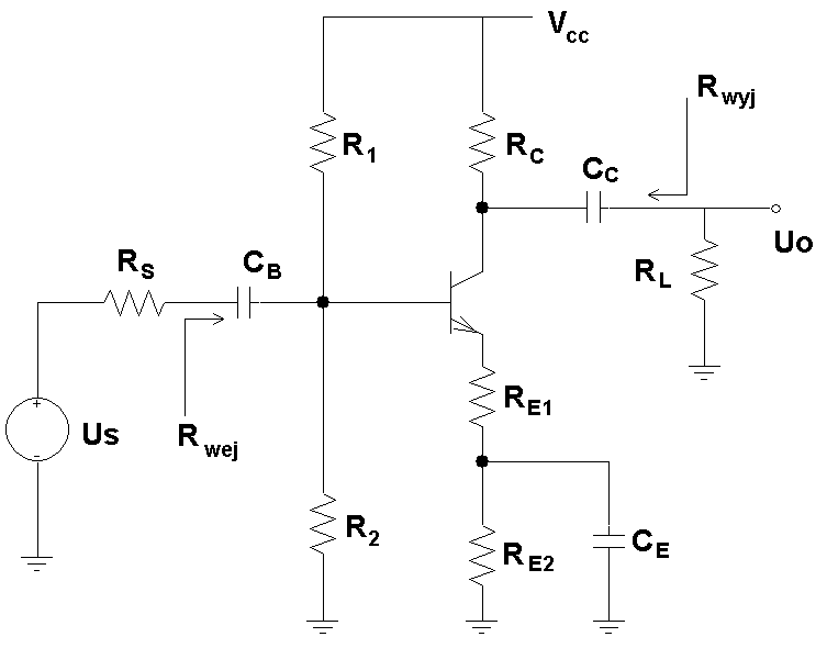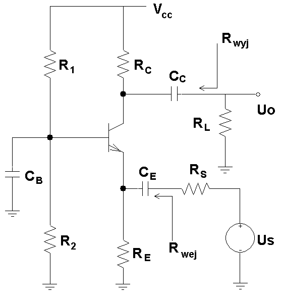 W układzie wzmacniacza w konfiguracji CE (wspólny emiter) wyznaczyć transmitancję napięciową (wzmocnienie napięciowe) oraz Rwej i Rwyj.