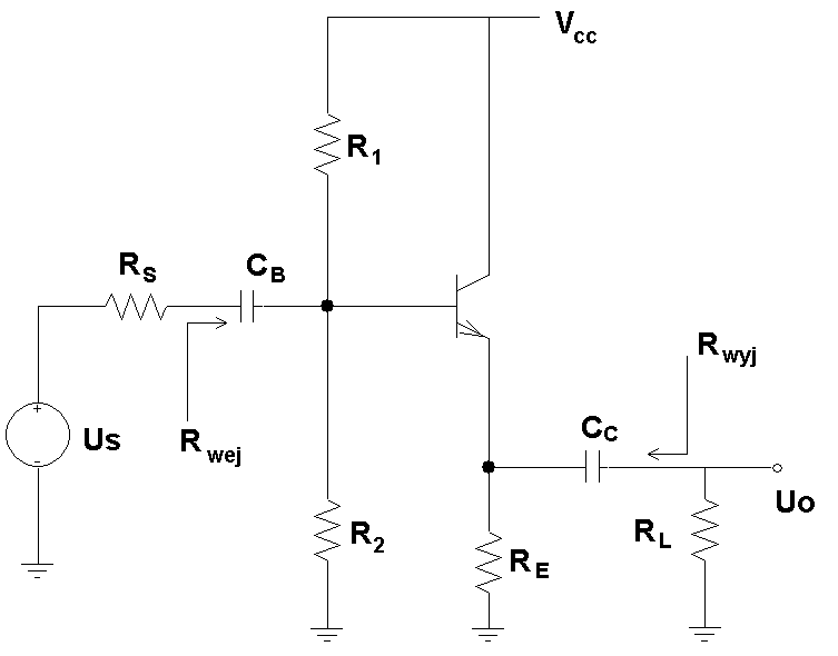 W układzie wzmacniacza w konfiguracji CC (wspólny kolektor) wyznaczyć transmitancję napięciową (wzmocnienie napięciowe) oraz Rwej i Rwyj.