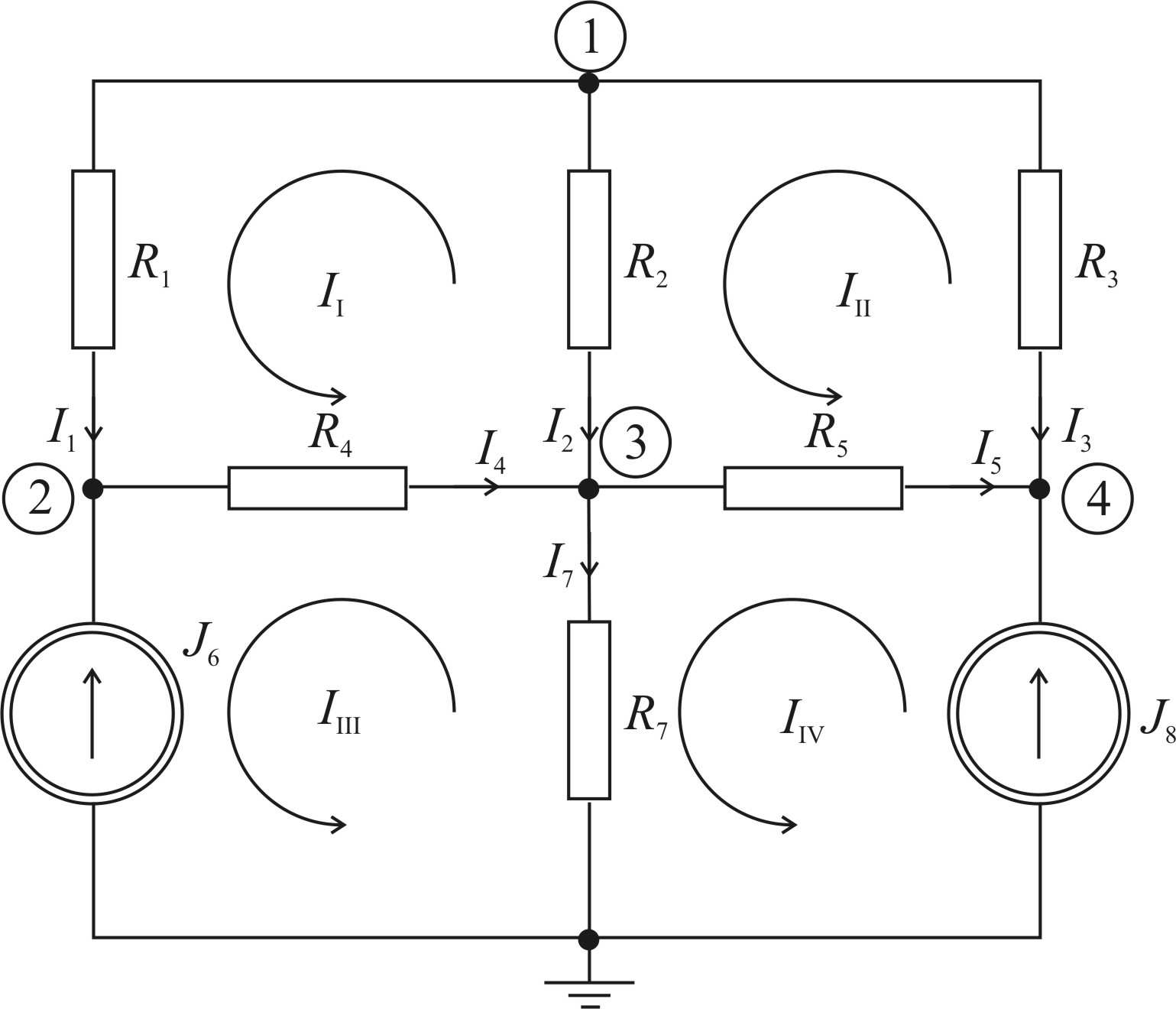 Metoda prądów oczkowych: I1⋅(R1 + R2 + R4) − I2⋅R2 − I3⋅R4 = 0
