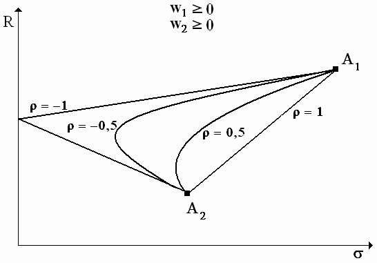 Zbiory możliwości (tj. zbiory wszystkich portfeli możliwych do utworzenia z danych dwóch akcji) dla różnych współczynników korelacji są przedstawione na poniższym wykresie (przy braku możliwości dokonywania krótkiej sprzedaży).