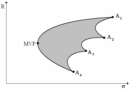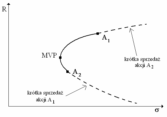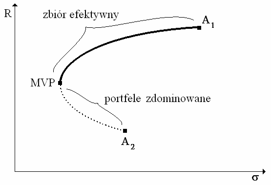 Zbiór efektywny reprezentuje krzywa łącząca punkty MVP oraz A1. Można także wyznaczyć MVP analitycznie, jest to jednak zdecydowanie bardziej skomplikowane niż