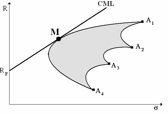 σA – odchylenie standardowe stopy zwrotu z portfela akcji Zbiór efektywny jest półprostą oznaczoną jako CML (M oznacza portfel rynkowy).