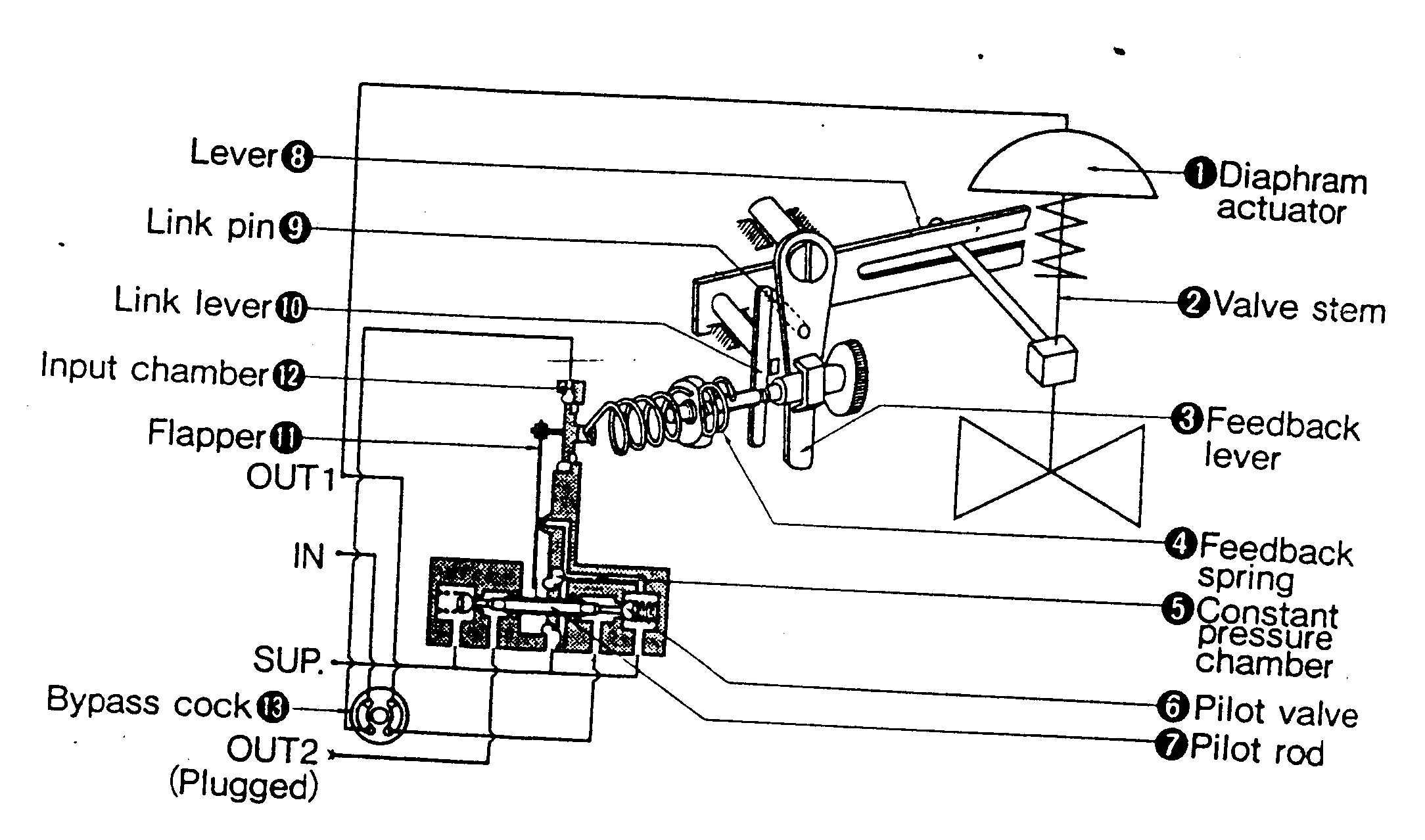 Działanie pozycjonera omówione jest na przykładzie pozycjonera typu dźwigniowego pojedynczego działania – dla przypadku rosnącej wartości sygnału sterującego. Sygnał sterujący (IN) z regulatora zasila komorę wejściową (12) przez zawór obejścia (13). Różnica powierzchni pomiędzy membranami generuję siłę, która przemieszcza przesłonę (11) w lewo.