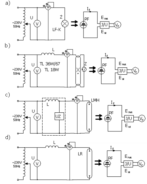 Rys. 5. Schematy układów pomiarowych badanych lamp: a) żarówki i świetlówki kompaktowej, b) świetlówki liniowej (zwykła, bililityczna i niebieska), c) lampy metalohalogenkowej i lampy rtęciowej