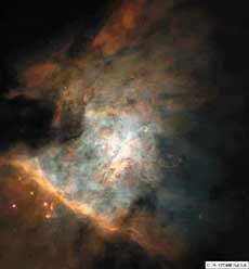 się w odległości około 7 tysięcy lat świetlnych od Ziem i u góry Wielką Mgławicę w Orionie M42 (na