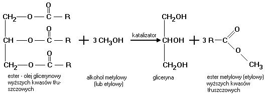 lepkości oleju jest poddanie go transestryfikacji, to jest poddanie go działaniu metanolu lub etanolu z użyciem odpowiedniego katalizatora, na skutek czego otrzymuje się estry metylowe lub etylowe kwasów tłuszczowych o znacznie mniejszych cząsteczkach oraz mniejszej