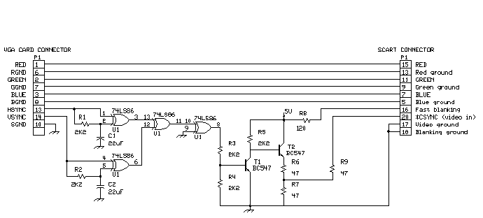 Konwerter VGA -> SCART (74LS86) Konwerter umożliwiający uzyskanie obrazu z komputera poprzez kartę nieposiadającą wyjścia Tv-Out.