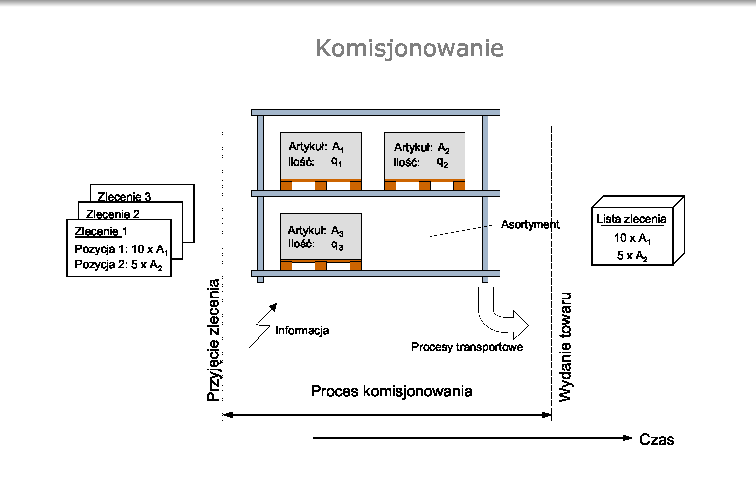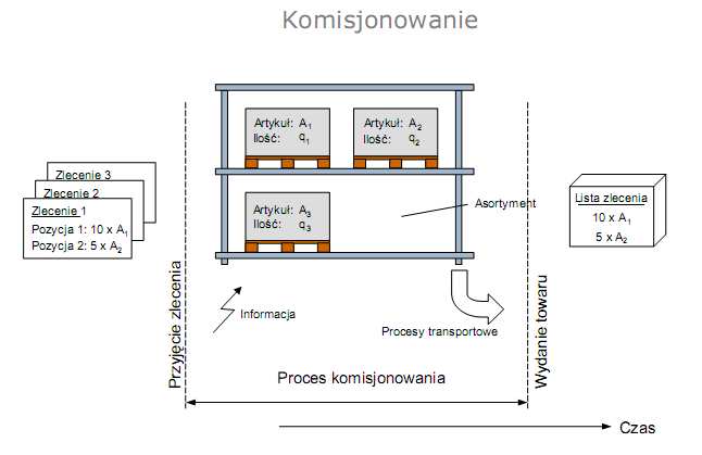 •Towar jest przenoszony do miejsca komisjonowania, a pozostała ilość na jednostce paletowej lub opakowaniu zbiorczym wraca na miejsce składowania w magazynie. Na jedno zlecenie komisjonowania towaru będzie niewiele pozycji asortymentowych, przy czym będą to pozycje o dużej ilości pobrania. Czasy wykonania operacji będą w tym wypadku długie. Spodziewać się można dodatkowych operacji jak ważenie czy pakowanie w jednostkę zbiorczą.