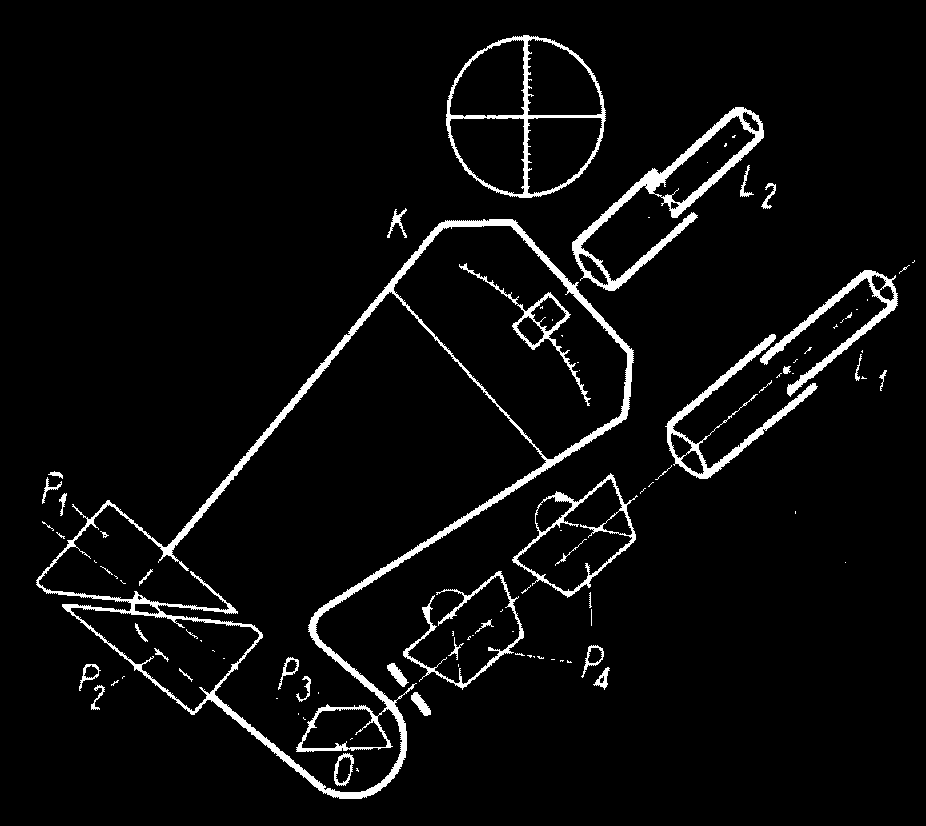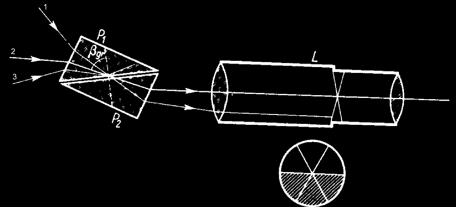 Dzięki temu linia graniczna w polu widzenia lunetki jest pozbawiona tęczowych obwódek i odpowiada kątowi granicznemu dla linii D sodu. Co więcej, kąt obrotu obu pryzmatów P , 4 które obracają