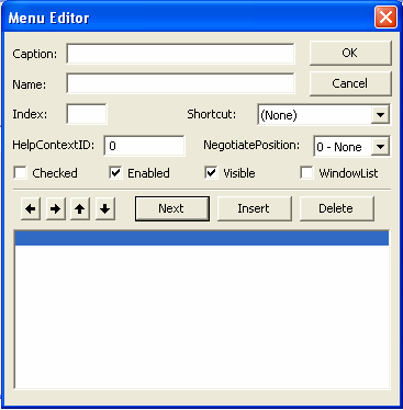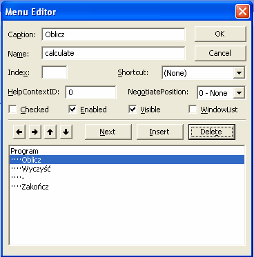 Posługując się strzałkami oraz przyciskami Next, Insert oraz Delete należy zbudować menu według wzoru podanego poniżej. Każda pozycja menu musi mieć wypełnione pole Caption oraz Name