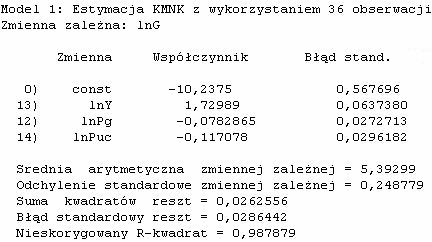 gdzie G jest konsumpcją benzyny w mld litrów, Y to dochód per capita ($), Pg jest ceną benzyny ($), zaś Puc – ceną używanych samochodów ($).