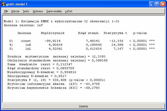 Korzystając z danych dotyczących produkcji, kapitału i pracy, po zlogarytmowaniu ich i oszacowaniu modelu, otrzymujemy: