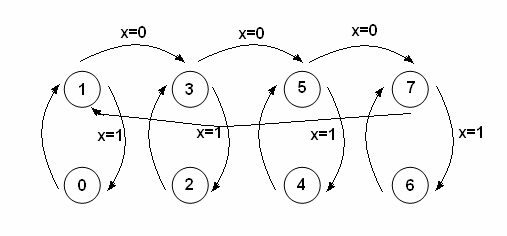 8. Zaprojektować licznik synchroniczny wyposażony w wejście sterujące x realizujący następujący diagram stanów . Do budowy licznika należy wykorzystać przerzutniki typu D.