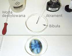 Rozdzielenie składników atramentu lub tuszu z flamastra metodą chromatografii – zastosuj różne dostępne w domu ciecze np. wodę, ocet ... Zapisz wnioski.