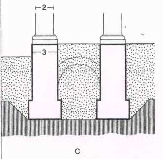 XI. Zakładanie fundamentów. A - dla budowli lekkich, B - dla budowli nonumentalnych, C - pod kolumnami, D - na gruncie bagnistym