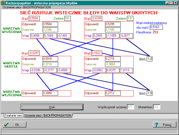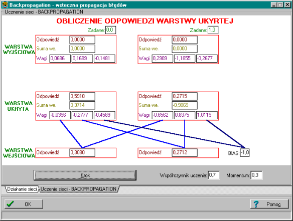 Kolejne naciśniecie klawisza “Krok” rozpoczyna proces symulacji przetwarzania sygnałów w sieci. Początkowo obliczane są odpowiedzi warstwy wejściowej. W każdej kolejnej warstwie obliczane są i wyświetlane (na niebiesko) sumy wartości przemnażanych przez odpowiednie wagi sygnałów wejściowych (wraz ze składnikiem BIAS). Drogi przesyłania tych sygnałów oznaczone są w postaci niebieskich linii.