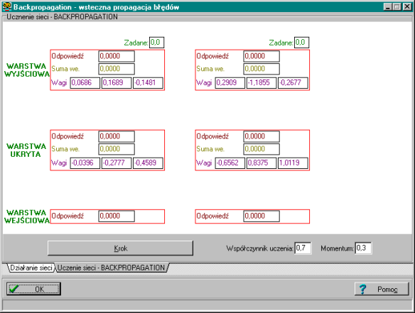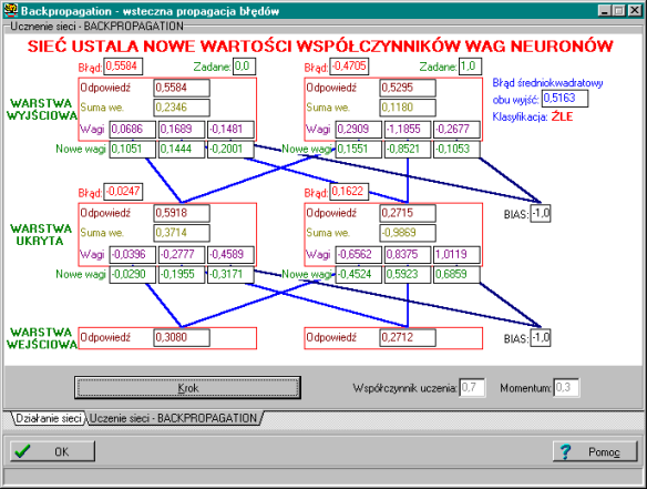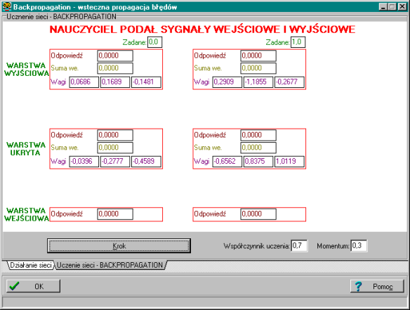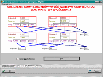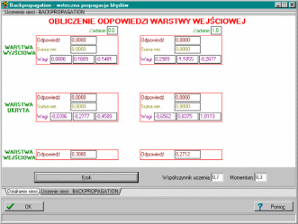 Ostatnim etapem prezentacji jest wyliczenie odpowiedzi warstwy wyjściowej. Po zakończeniu prezentacji użytkownik może przystąpić do uczenia sieci metodą backpropagation.