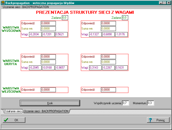 Po naciśnięciu przycisku Krok, sieć pokazuje wartości sygnałów wejściowych (podawane z zewnątrz przez neurony wejściowe), a także wartości współczynników wagowych - dla wszystkich wejść wszystkich neuronów (wyświetlane w kolorze fioletowym).