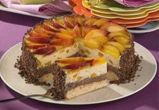 Jajka ubić z cukrem na parze. Dodać mąkę, proszek do pieczenia i kisiel. Dokładnie wymieszać. Piec 40 minut w temp. 180 st. C. Dwie i pół szklanki mleka zagotować z cukrem. Rozmącić żółtka, wymieszać z resztą mleka i budyniem, wlać do gotującego się mleka. Do utartego masła dodać ostudzoną masę. Podzielić na 2 części. Do jednej dodać kakao i pół tabliczki czekolady, do drugiej pokrojone brzoskwinie.
