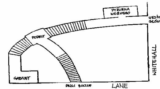 Przepisałem dwa następne artykuły, ale czując, że jestem coraz bardziej senny, wstałem i przespacerowałem się po pokoju. Nie mogłem zrozumieć, dlaczego jeszcze nie podano mi kawy. Otworzyłem więc drzwi gabinetu, w którym pracuję, i wyszedłem na ciemny i słabo oświetlony korytarz. Było to jedyne wyjście z mojego pokoju. W połowie drogi na klatce schodowej znajdował się mały podest, od którego pod kątem prostym odchodzi drugi, mniejszy korytarz. Na dole, jak już mówiłem, jest dyżurka woźnego. Korytarz biegnie dalej do schodków prowadzących do bocznych drzwi, używanych przez służbę i urzędników, którzy skracają sobie w ten sposób drogę z Charles Street. Proszę, tu jest odręczny szkic.