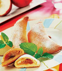 3. Ciasto rozwałkować na cienki placek, foremką wykroić krążki o średnicy 10 cm. Na każdy nałożyć duszone jabłka, złożyć na pół, dokładnie zlepić.